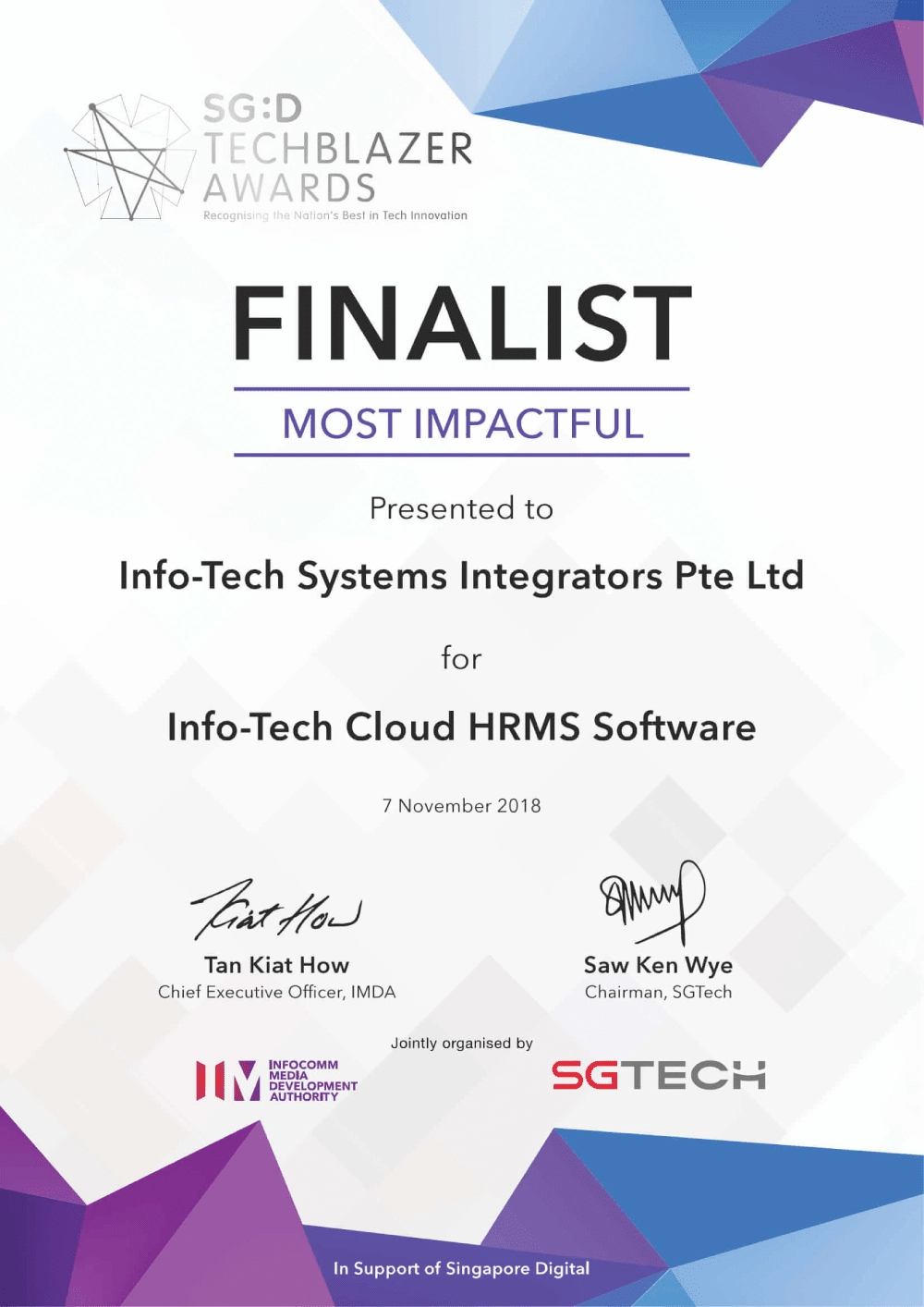 Info-Tech received Techblazer Award as Most Impactful System for Cloud HRMS Software (finalist) in 2018, organized by IMDA & SGTech.