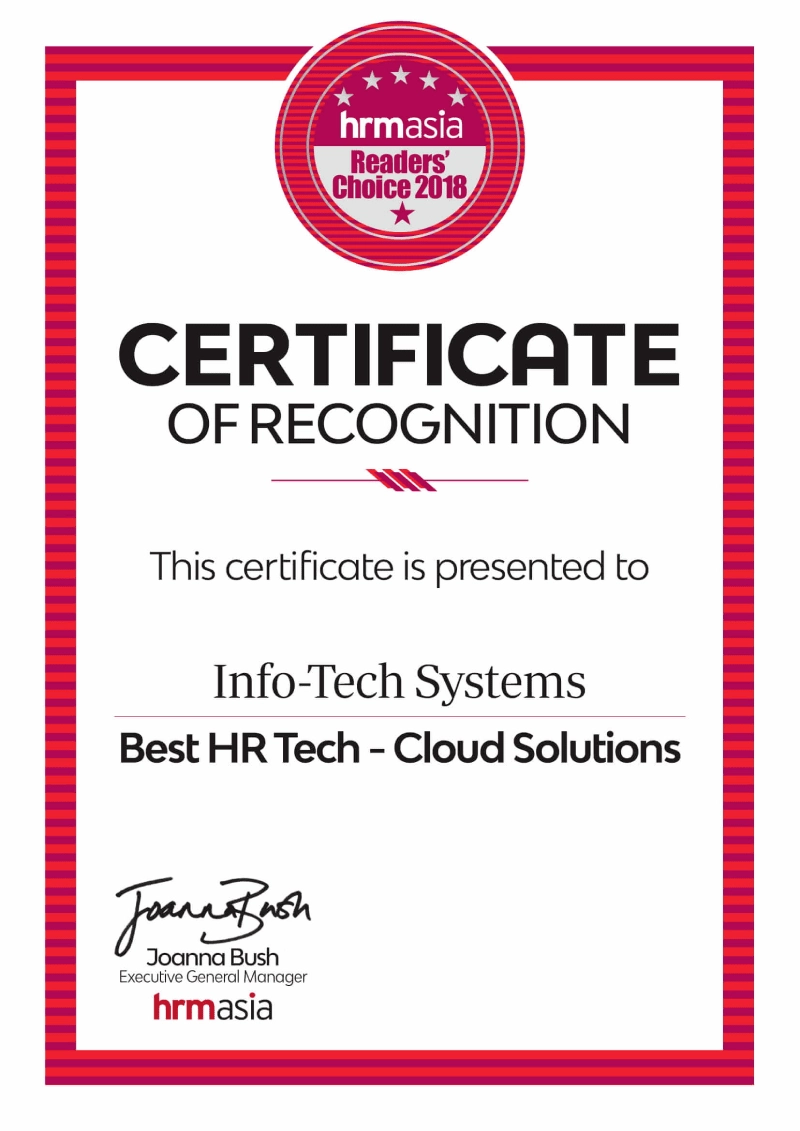 Info-Tech received “Best HR Tech Cloud Solution” Award in HRM Asia 2018.